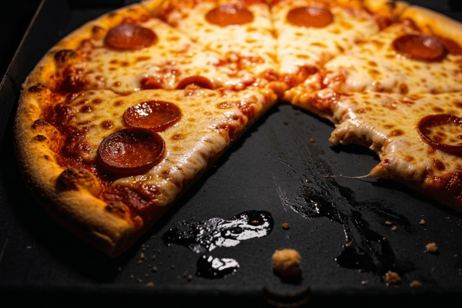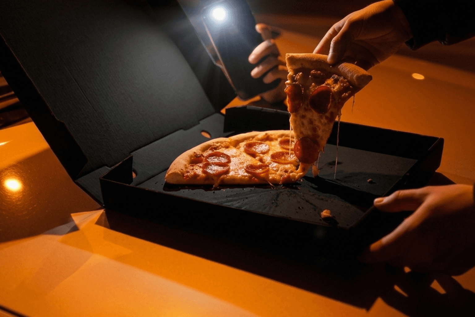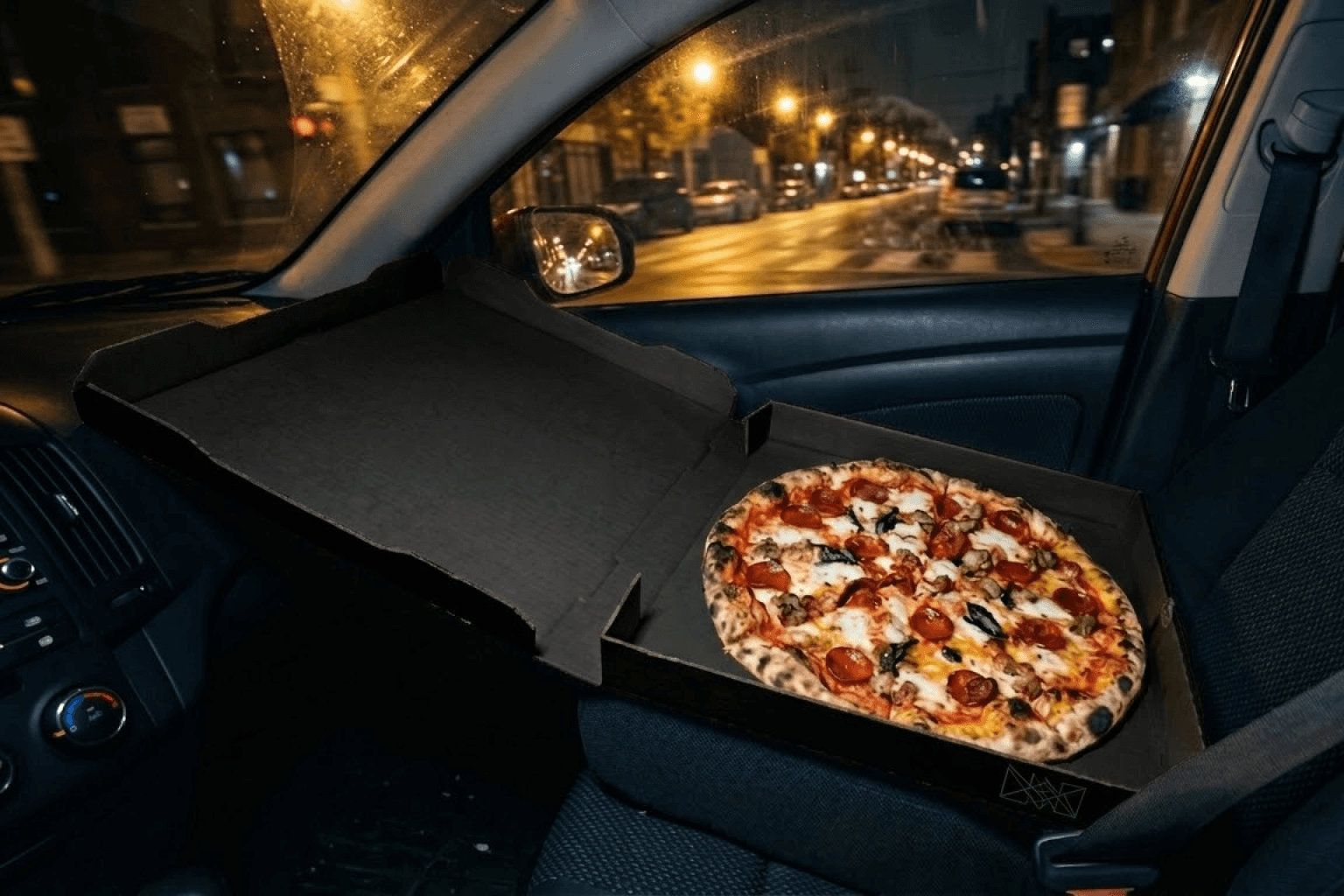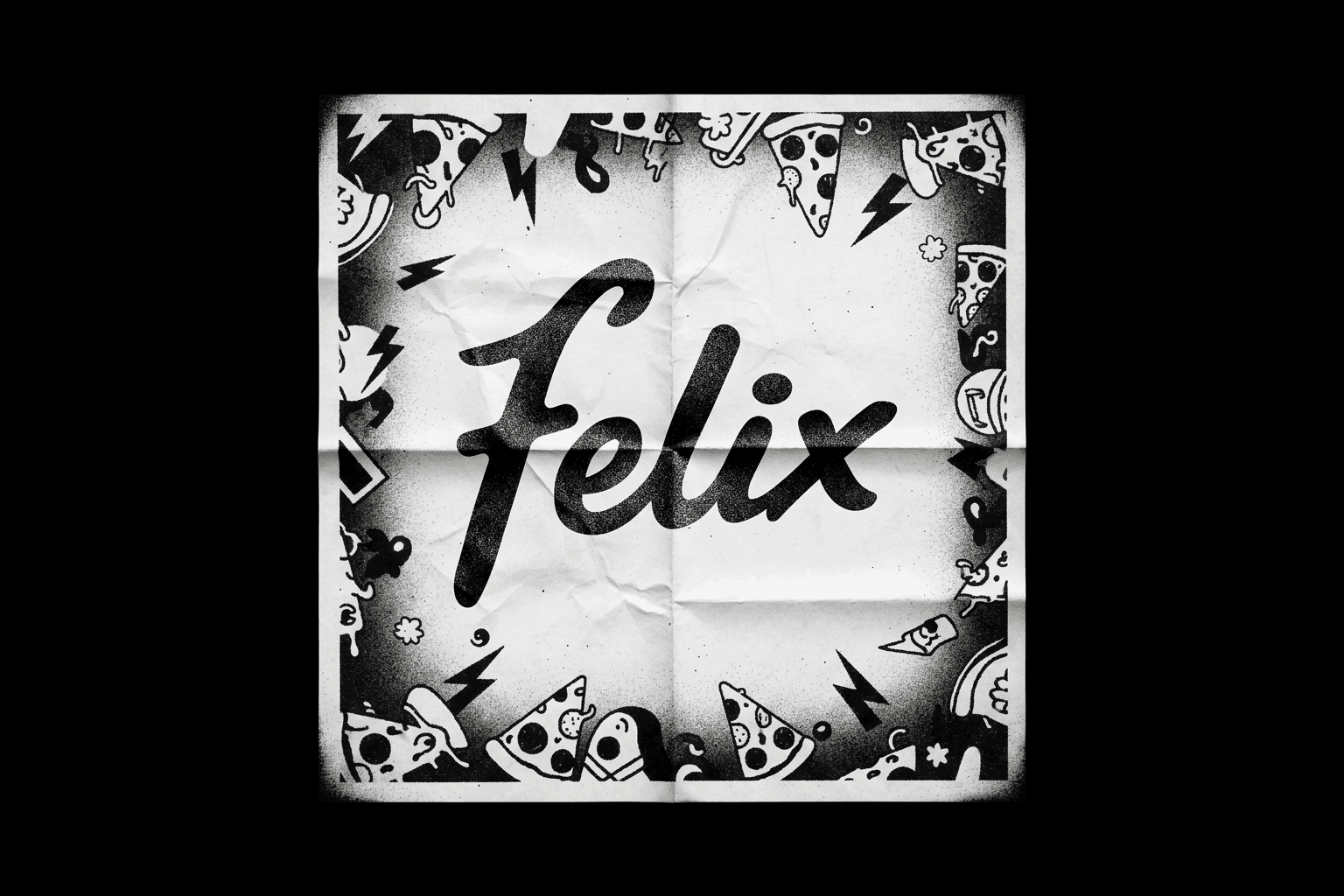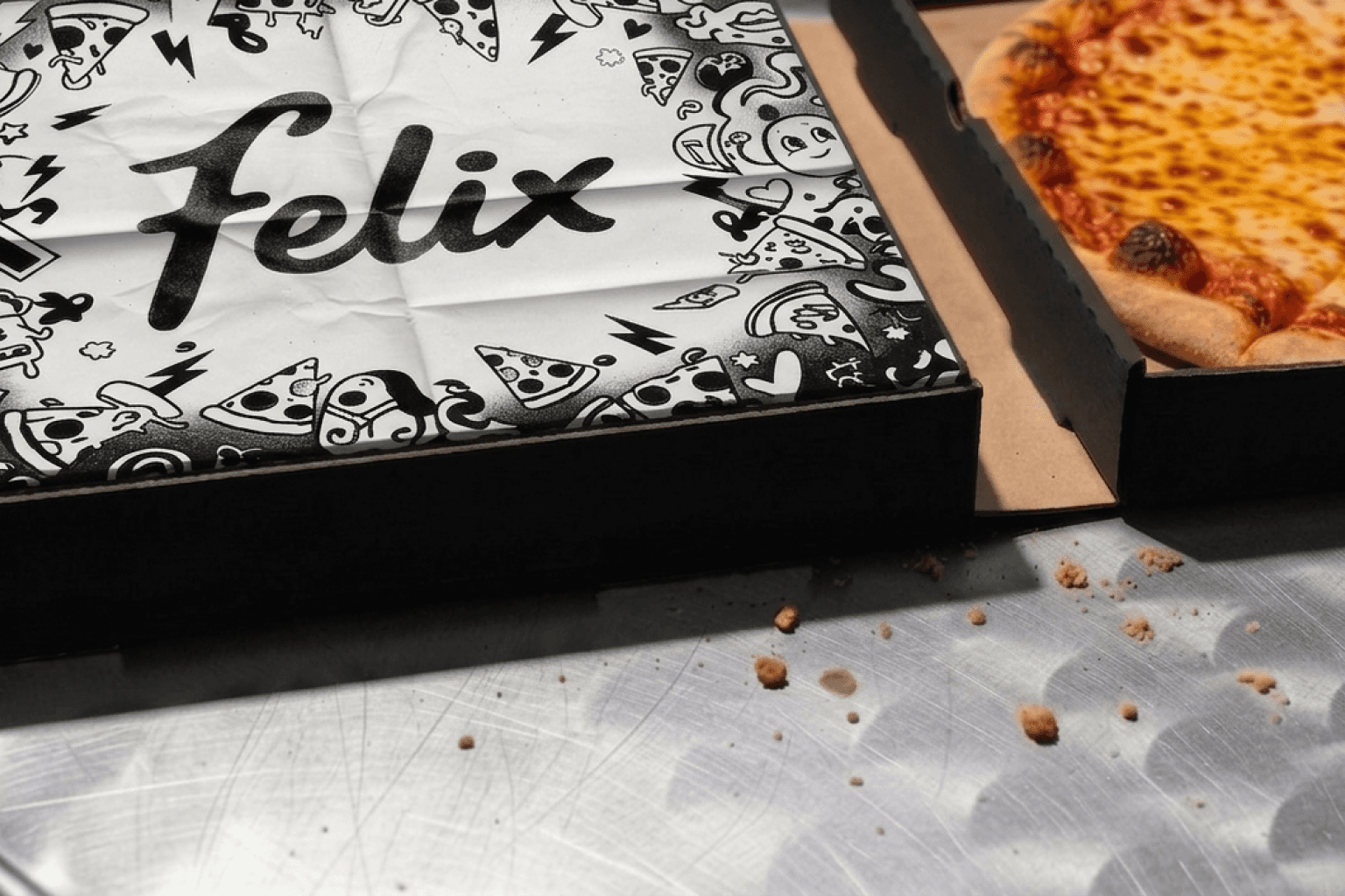 The final brand system positions the pizza box as the primary media channel. Every touchpoint — packaging, menus, posters, and digital assets — behaves like material produced on a nearly empty office photocopier. Logos fade, typography shifts subtly, and printed artifacts carry visible scan imperfections. Importantly, the imperfection lives only in the communication layer, never in the food or environment. Pizza photography rejects commercial styling in favour of documentary realism: natural light, casual social settings, and handheld camera behaviour consistent with how customers actually capture meals. The result is a brand that feels discovered rather than advertised.